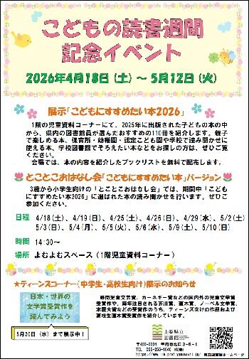 2026年4月18日(土曜日)から5月12日(火曜日)まで、2025年に出版された子どもの本の中から、県内の図書館員が選んだ「こどもにすすめたい本2026」110冊を展示します。また、3歳から小学生向けのとことこおはなし会で「こどもにすすめたい本」に選ばれた本の読み聞かせを行います。詳しくはチラシをご覧ください。