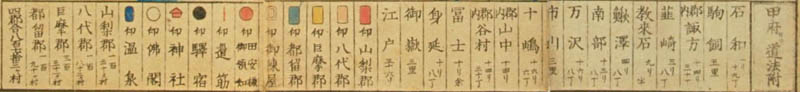 甲斐国絵図(かいこくえず) 文政8年(1825)、巨摩郡鰍沢駅(南人巨摩郡鰍沢町)古久屋門右衛門正之(こくやもんえもんまさゆき)蔵版になる甲斐国の絵図です。山や川がきれいな色彩で描かれ、当時の村名が詳細に記入されています。また、宿駅や神社・仏閣、それに温泉までが記号で表されていて、当時の甲斐国の概要が一目でわかるよう工夫されています。