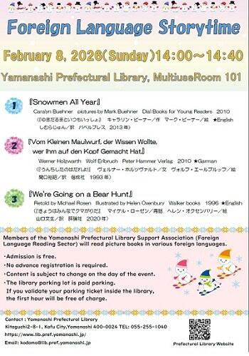 山梨県立図書館協力会(外国語による読み聞かせ分野)協力員の皆さんが、外国語の絵本の読み聞かせをします。 Members of the Yamanashi Prefectural Library Support Association (Foreign Language Reading Sector) will read picture books in various foreign languages.